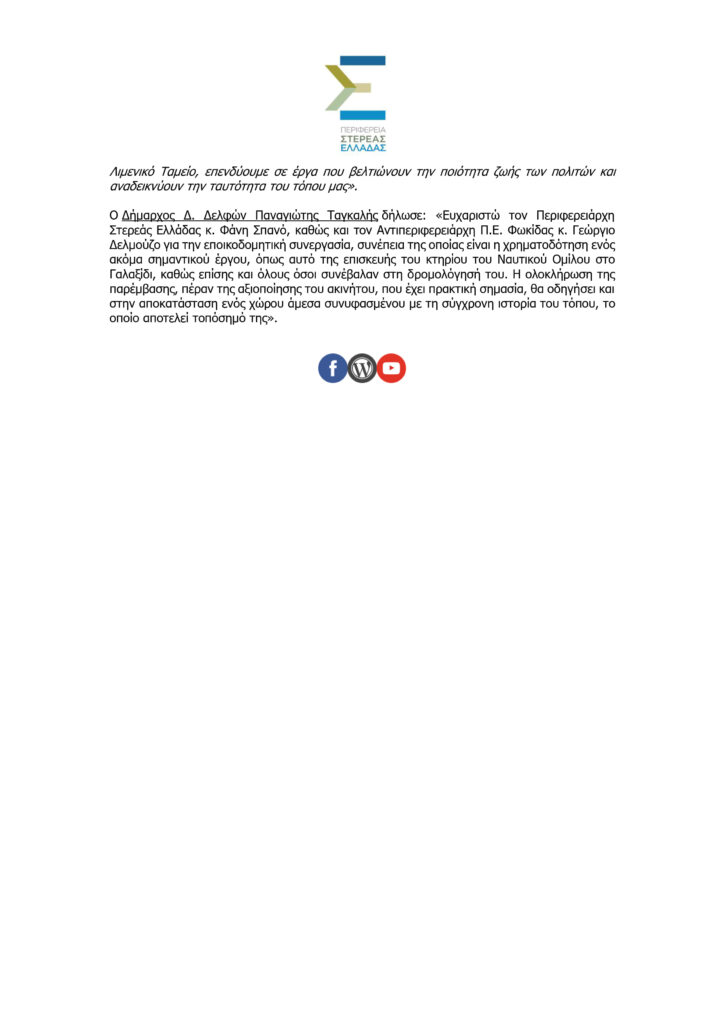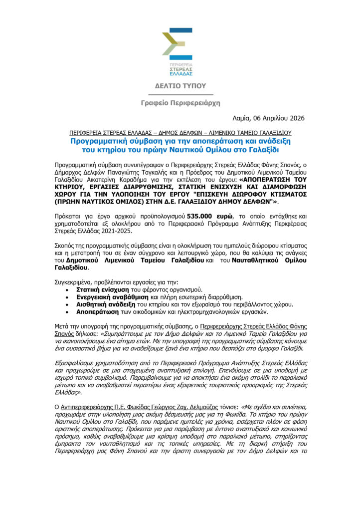 Προγραμματική σύμβαση για την αποπεράτωση και ανάδειξη του κτηρίου του πρώην Ναυτικού Ομίλου στο ΓαλαξίδιIlias KoumparoulisApril 6, 2026Ανακοινώσεις Previous Post "το Γαλαξείδι" – νέο φύλλο 817, Φεβρουάριος 2026 Next Post Επετειακές εκδηλώσεις Απελευθέρωσης του Κάστρου των Σαλώνων