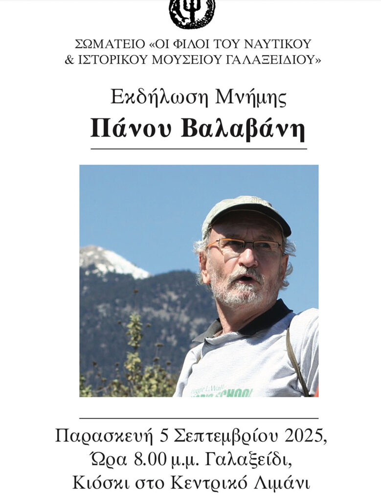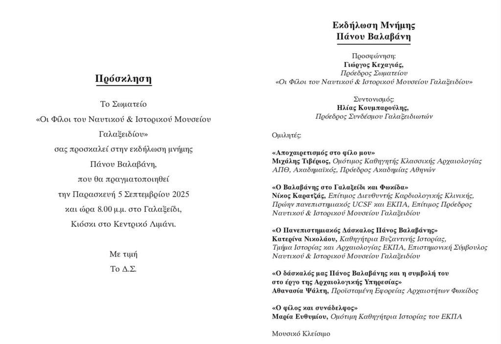 Το Σωματείο “Οι Φίλοι του Ναυτικού και Ιστορικού Μουσείου Γαλαξειδίου” σας προσκαλεί σε εκδήλωση μνήμης για τον πρόσφατα εκλιπόντα Καθηγητή Κλασικής Αρχαιολογίας του Πανεπιστημίου Αθηνών, Πάνο Βαλαβάνη.